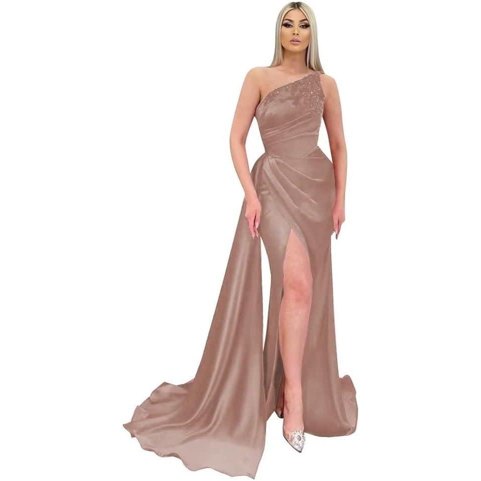 Appliques Mermaid Bridesmaid Dresses One Shoulder Prom Dress for Women Bodycon Formal Evening Gown with Slit(Dusty Rose)