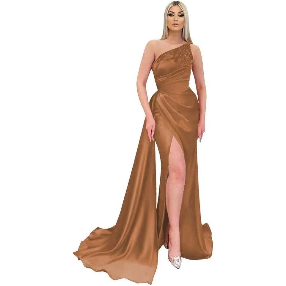 Appliques Mermaid Bridesmaid Dresses One Shoulder Prom Dress for Women Bodycon Formal Evening Gown with Slit(Ligth Borwn)