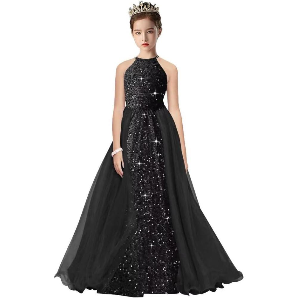 Halter Pageant Gowns Girls Sparkly Sequin Ball Gown Flower Girl Dresses with Tulle Cape Kids Toddle Dress(Black)