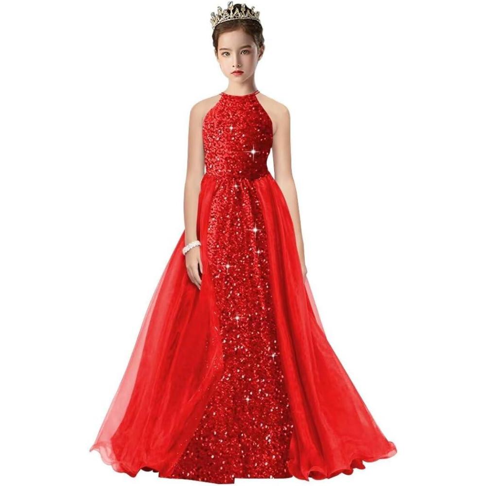 Halter Pageant Gowns Girls Sparkly Sequin Ball Gown Flower Girl Dresses with Tulle Cape Kids Toddle Dress(Red)