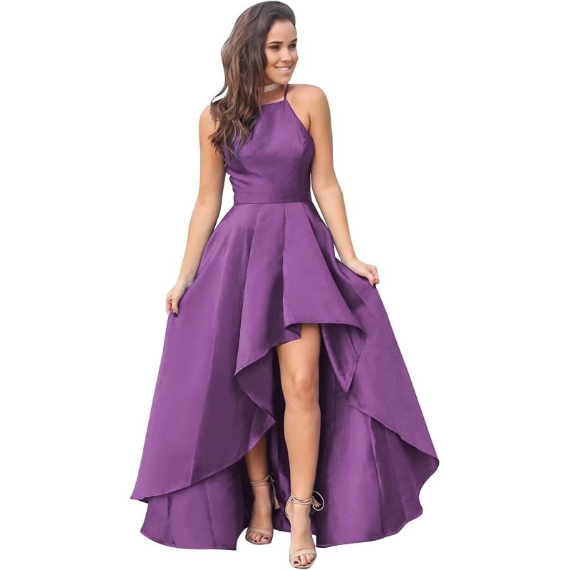 Be the first to review “High Low Prom Dress Satin Halter A Line Formal Evening Gown Wedding Guest Party Cocktail Dress with Pockets(Purple)”