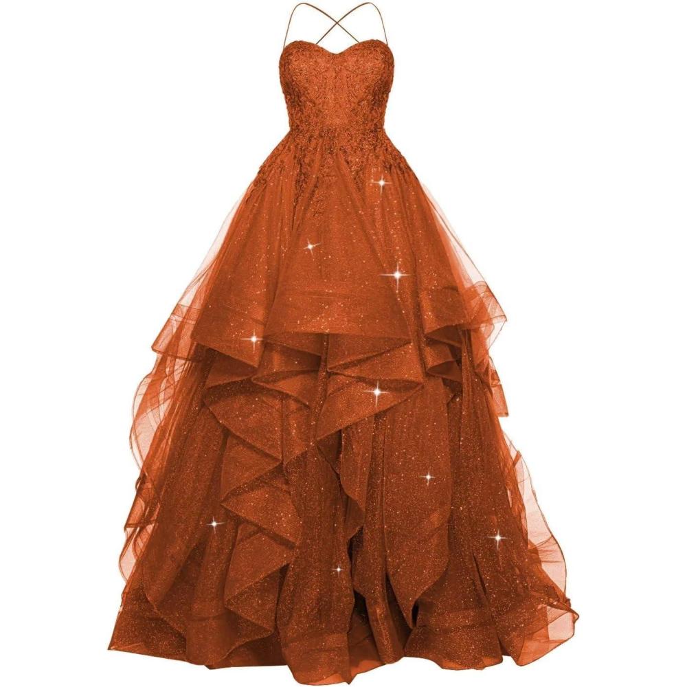 homdor Lace Appliques Tulle Prom Dresses Long Spaghetti Straps Layered Quinceanera Dresses Sweetheart Ball Gowns(Burnt Orange)