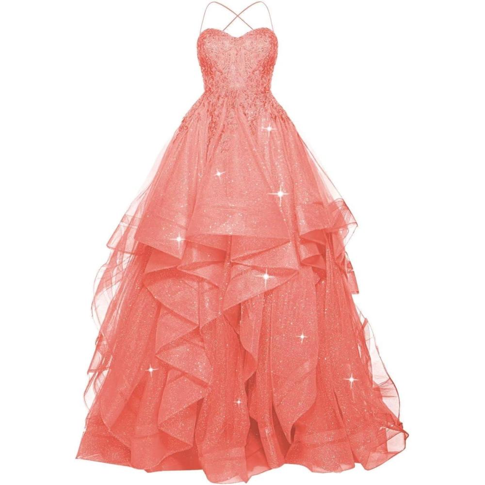 Get your hands on our exclusive homdor Lace Appliques Tulle Prom Dresses Long Spaghetti Straps Layered Quinceanera Dresses Sweetheart Ball Gowns(Coral) collection, now at a discounted price.