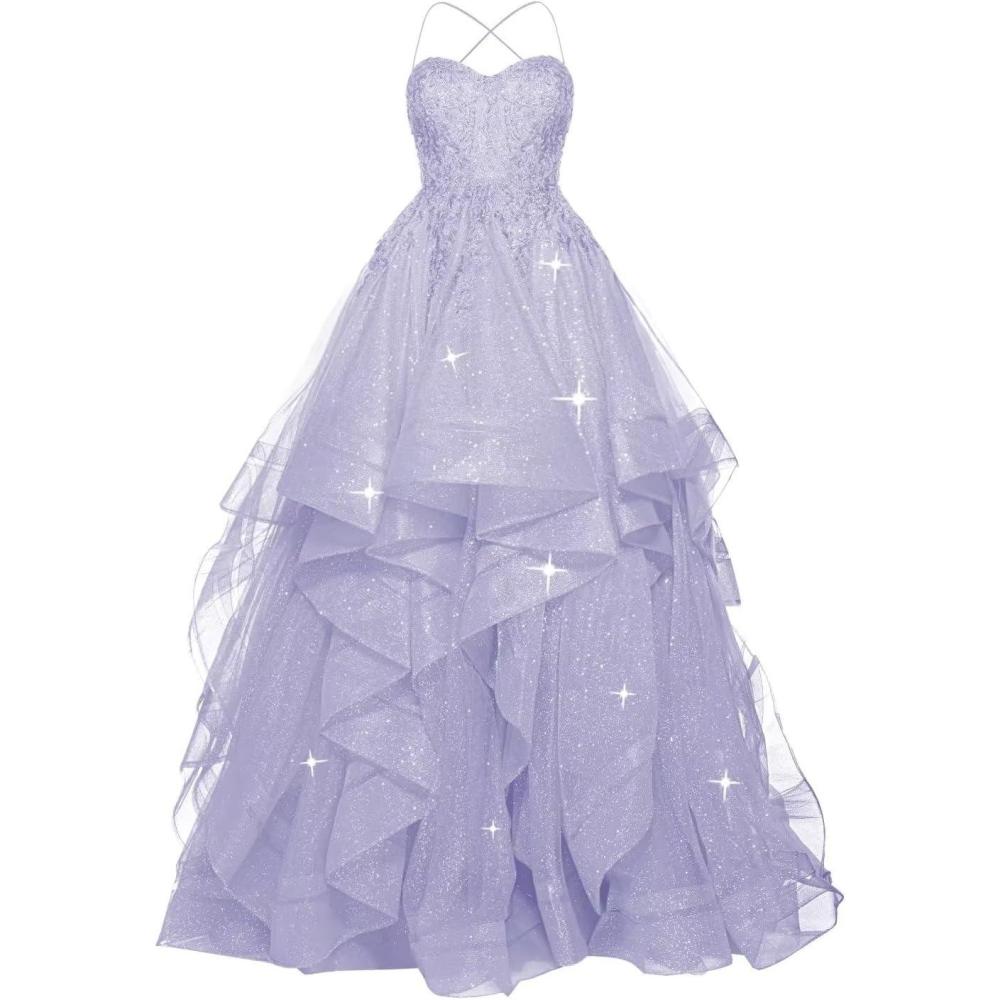 homdor Lace Appliques Tulle Prom Dresses Long Spaghetti Straps Layered Quinceanera Dresses Sweetheart Ball Gowns(Lavender)