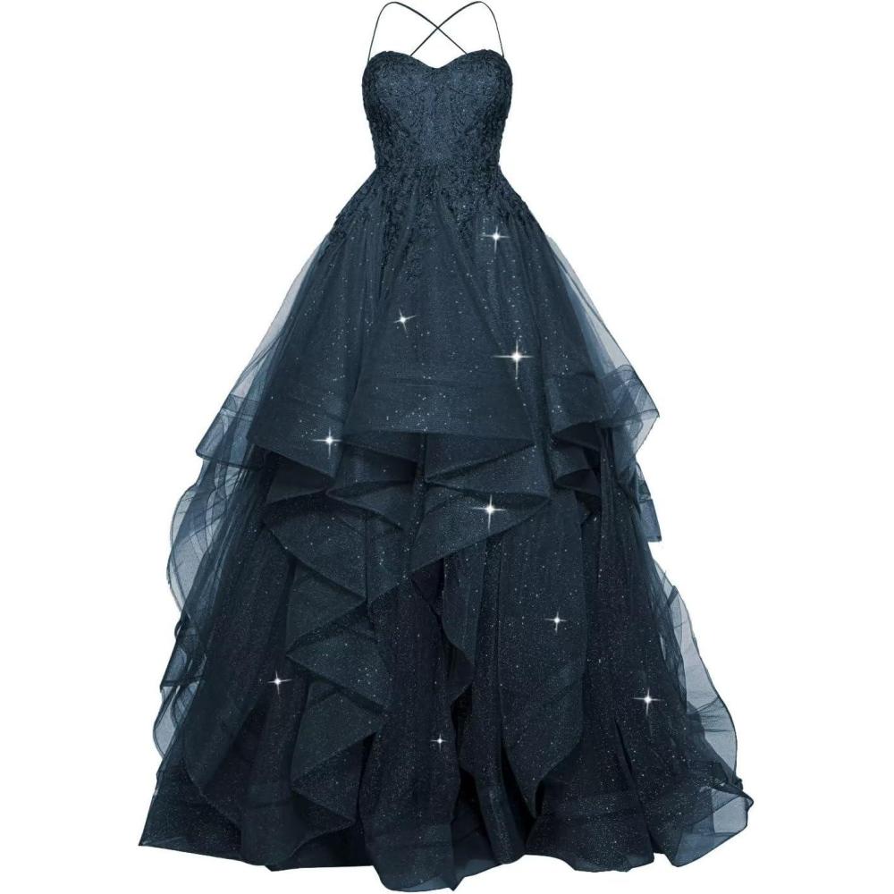 homdor Lace Appliques Tulle Prom Dresses Long Spaghetti Straps Layered Quinceanera Dresses Sweetheart Ball Gowns(Navy Blue)