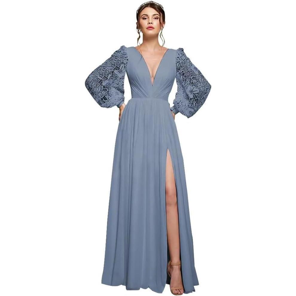 homdor Long Sleeve Bridesmaid Dresses Chiffon Prom Dress Long Lace Applique Wedding Dress V Neck Formal Gowns with Slit(Dusty Blue)