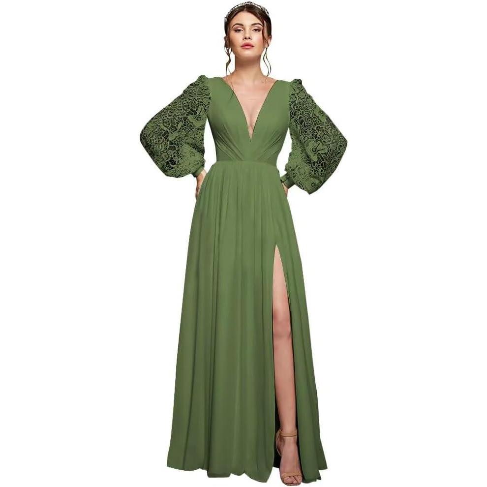 homdor Long Sleeve Bridesmaid Dresses Chiffon Prom Dress Long Lace Applique Wedding Dress V Neck Formal Gowns with Slit(Olive)