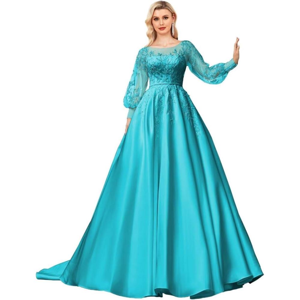 homdor Long Sleeve Prom Dresses Lace Applique Wedding Dress Satin Ball Gown A Line Formal Evening Gowns(Aqua)