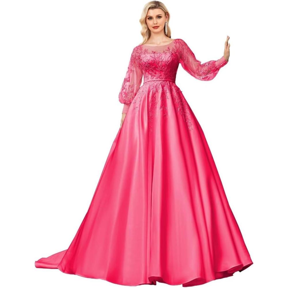 homdor Long Sleeve Prom Dresses Lace Applique Wedding Dress Satin Ball Gown A Line Formal Evening Gowns(Hot Pink)