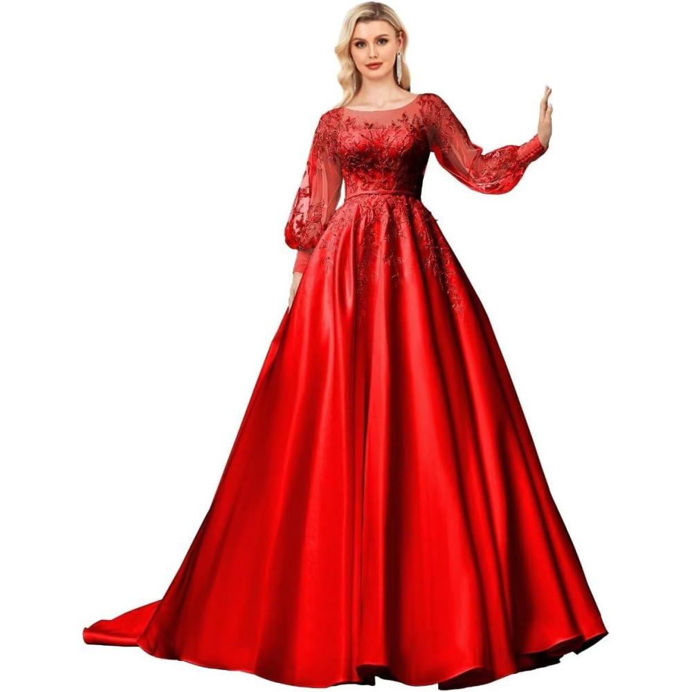 homdor Long Sleeve Prom Dresses Lace Applique Wedding Dress Satin Ball Gown A Line Formal Evening Gowns(Red)