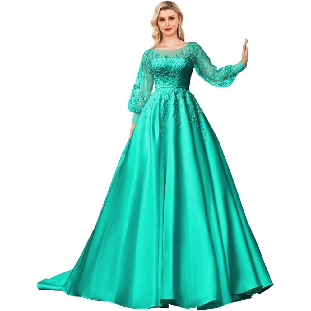 homdor Long Sleeve Prom Dresses Lace Applique Wedding Dress Satin Ball Gown A Line Formal Evening Gowns(Turquoise)