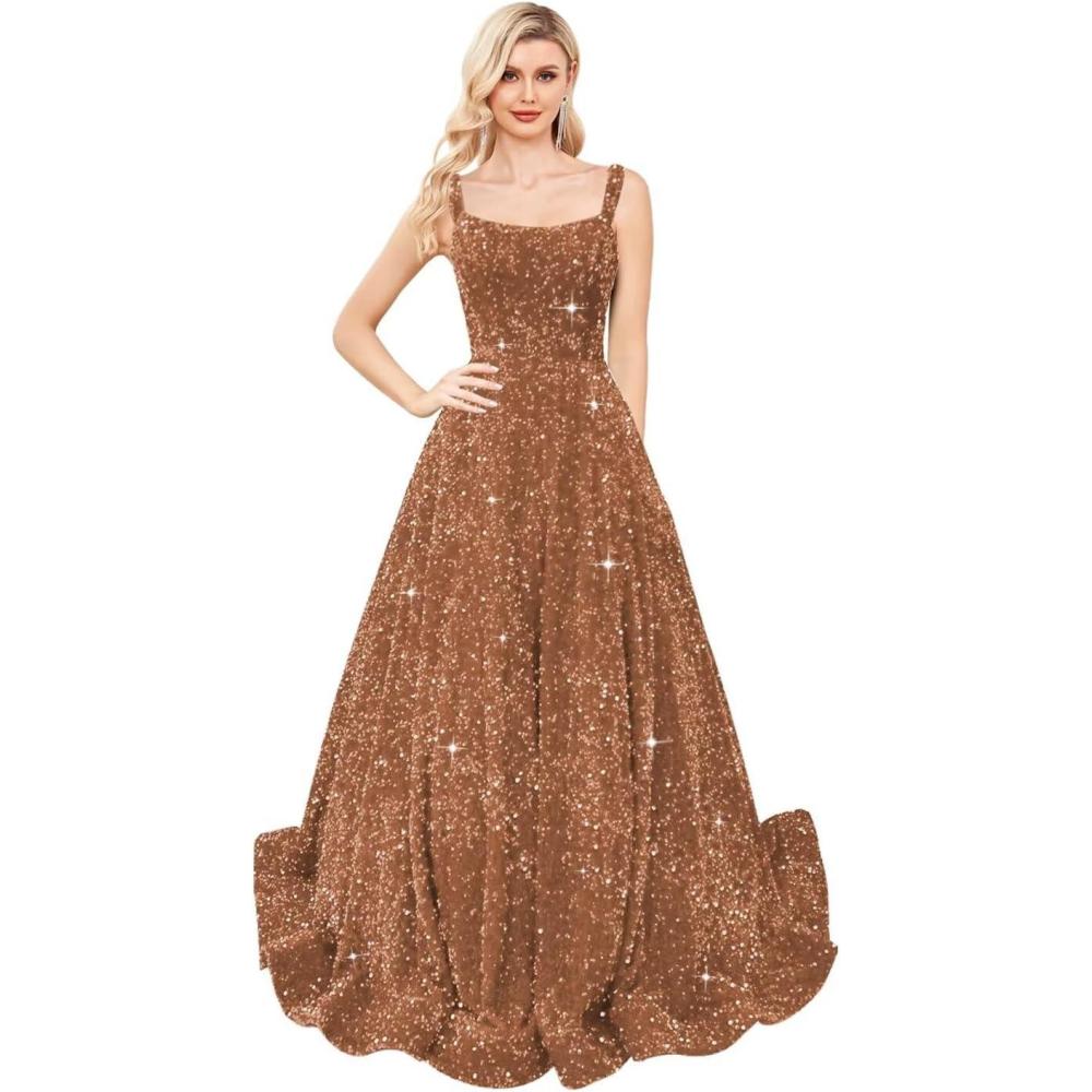 homdor Sequin Prom Dresses Long A Line Ball Gowns for Women Sparkly Spaghetti Straps Formal Dress(Dusty Rose)