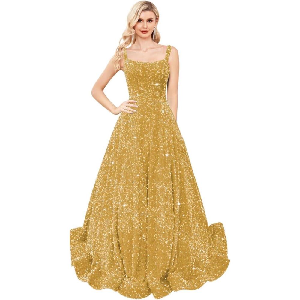 homdor Sequin Prom Dresses Long A Line Ball Gowns for Women Sparkly Spaghetti Straps Formal Dress(Gold)