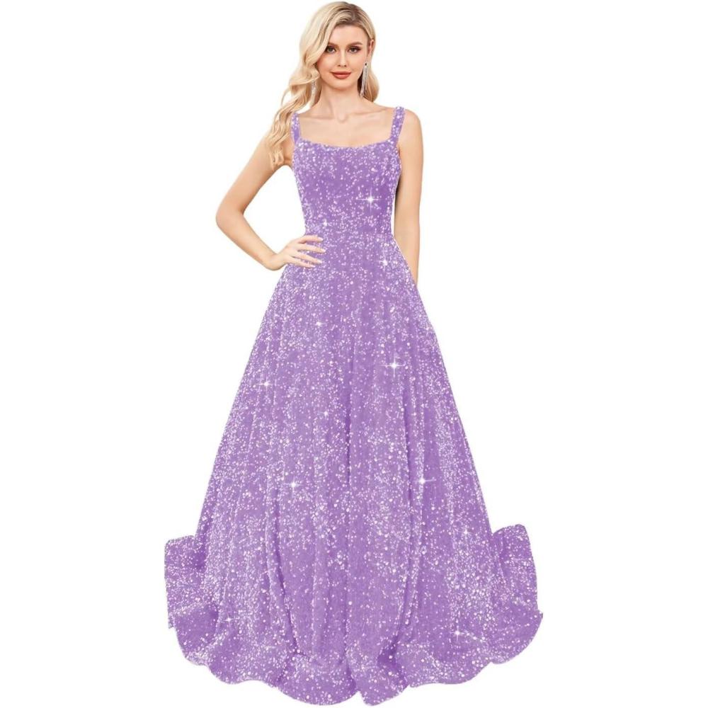 homdor Sequin Prom Dresses Long A Line Ball Gowns for Women Sparkly Spaghetti Straps Formal Dress(Lilac)