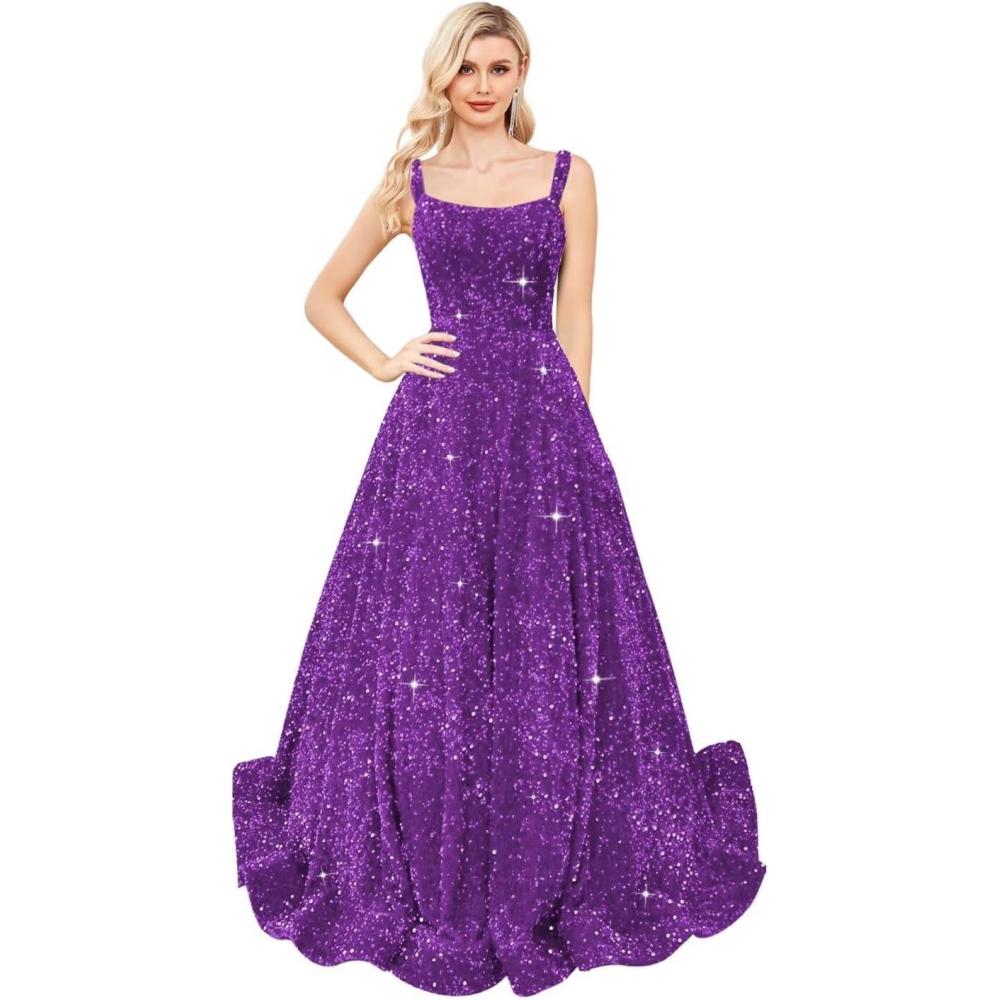 homdor Sequin Prom Dresses Long A Line Ball Gowns for Women Sparkly Spaghetti Straps Formal Dress(Purple)