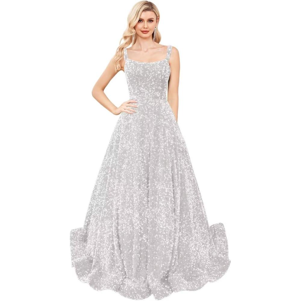 homdor Sequin Prom Dresses Long A Line Ball Gowns for Women Sparkly Spaghetti Straps Formal Dress(White)