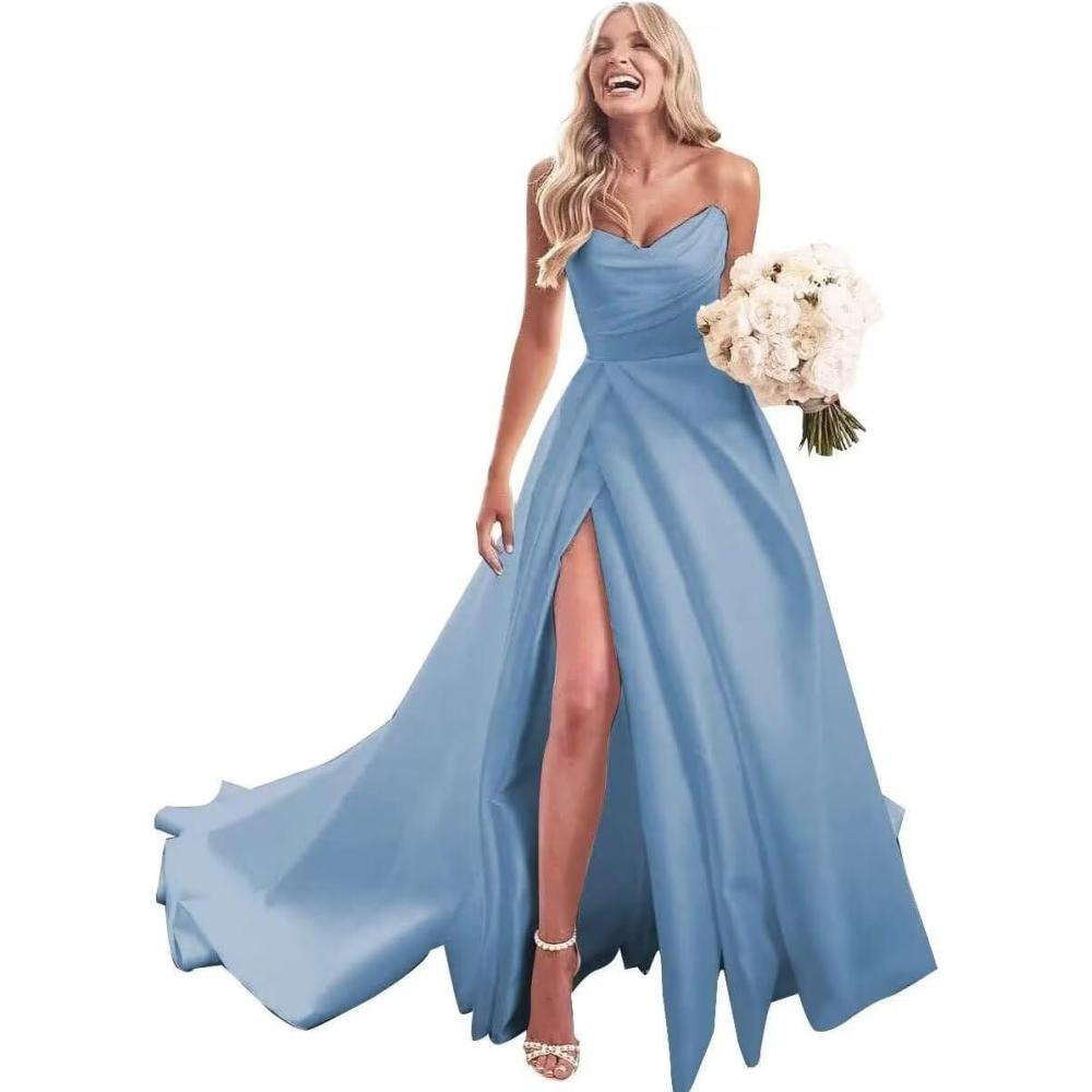 homdor Strapless Prom Dresses Long Ball Gown Satin Wedding Dress for Bride A Line Formal Evening Party Gowns with Slit(Dusty Blue)
