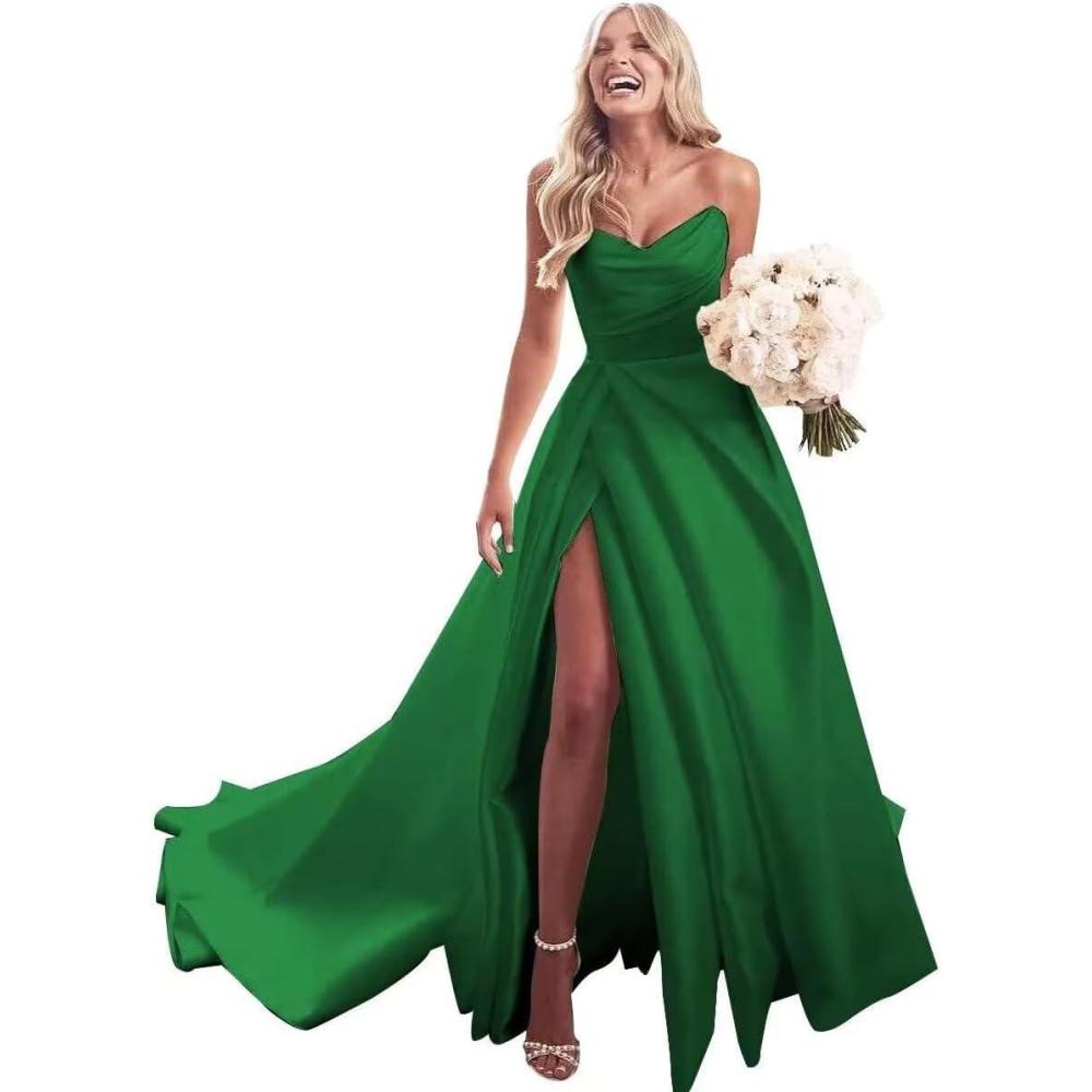 homdor Strapless Prom Dresses Long Ball Gown Satin Wedding Dress for Bride A Line Formal Evening Party Gowns with Slit(Green)