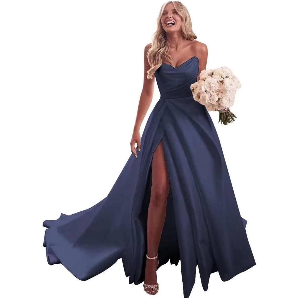homdor Strapless Prom Dresses Long Ball Gown Satin Wedding Dress for Bride A Line Formal Evening Party Gowns with Slit(Navy Blue)