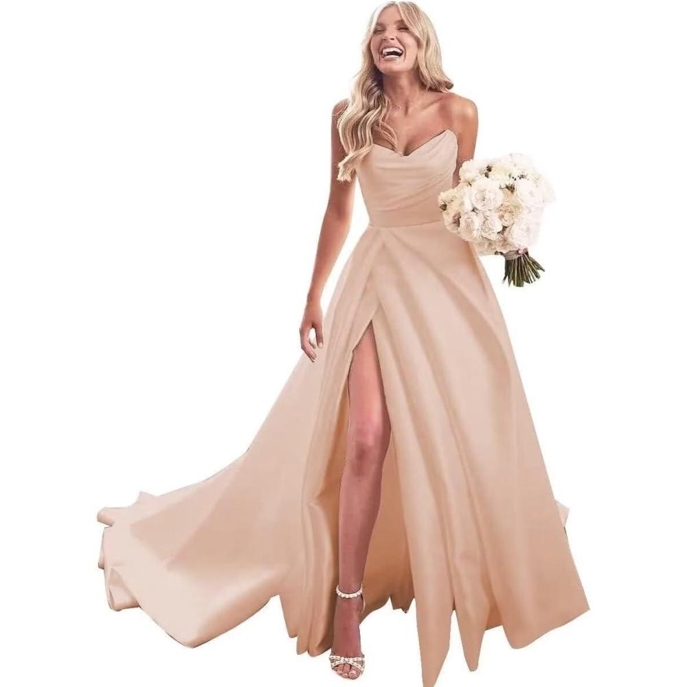 homdor Strapless Prom Dresses Long Ball Gown Satin Wedding Dress for Bride A Line Formal Evening Party Gowns with Slit(Peach)