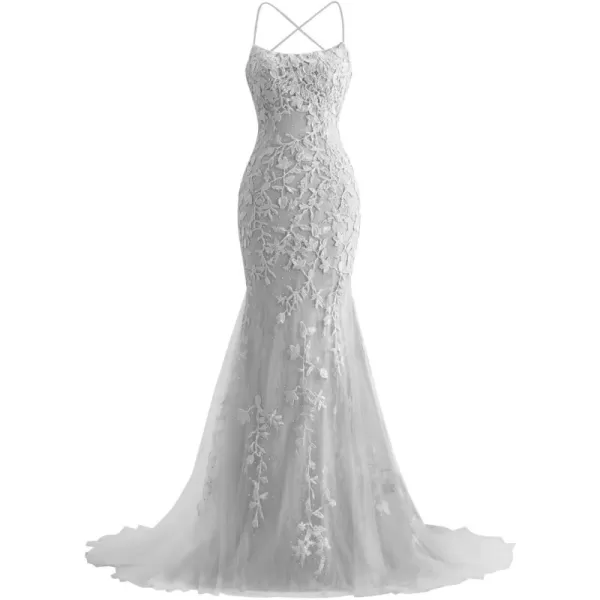 Lace Applique Mermaid Prom Dresses Long Spaghetti Straps Tulle Formal Dresses Tight Evening Gowns for Women(Dusty Blue)