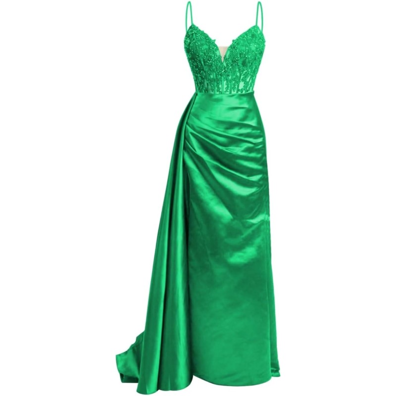Lace Applique Prom Dress Silk Stain Bridesmaid Dress Spaghetti Straps Formal Dresses for Women Evening Party(Green)