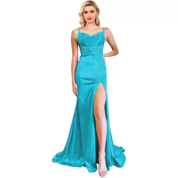 Lace Applique Prom Dresses Spaghetti Straps Mermaid Formal Dress for Women Silk Satin Evening Gowns with Slit(Blue)