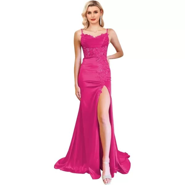 Lace Applique Prom Dresses Spaghetti Straps Mermaid Formal Dress for Women Silk Satin Evening Gowns with Slit(Derset Rose)
