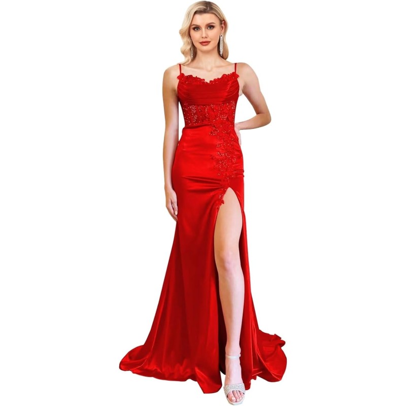 Be the first to review “Lace Applique Prom Dresses Spaghetti Straps Mermaid Formal Dress for Women Silk Satin Evening Gowns with Slit(Red)”