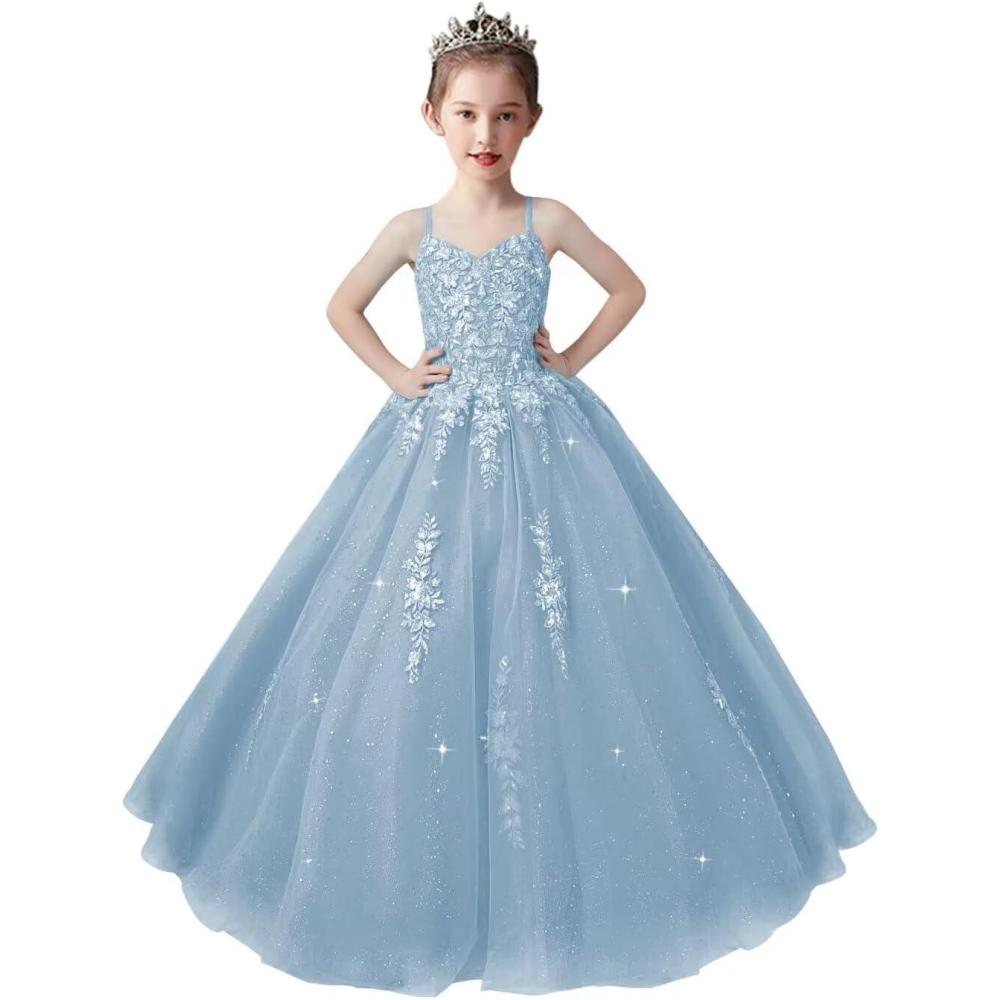 Lace Applique Tulle Pageant Gowns for Girls Ball Gown Flower Girl Dress Princess Toddler Kids Prom Dress(Dusty Blue)