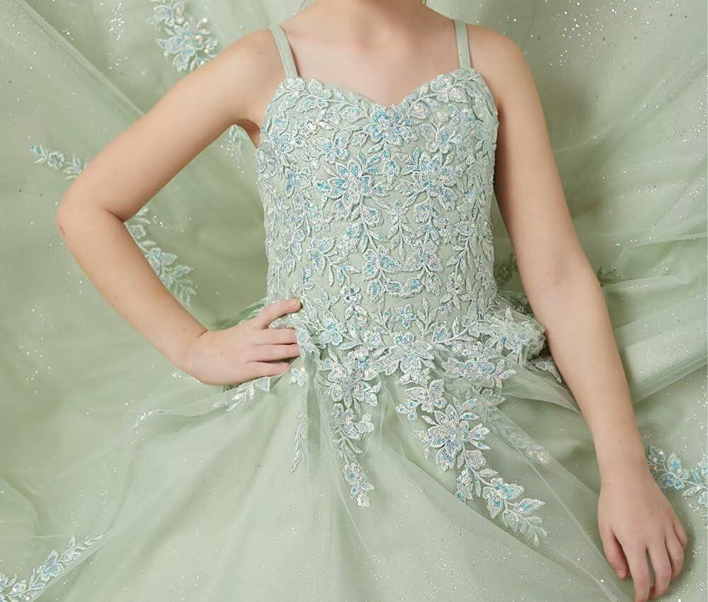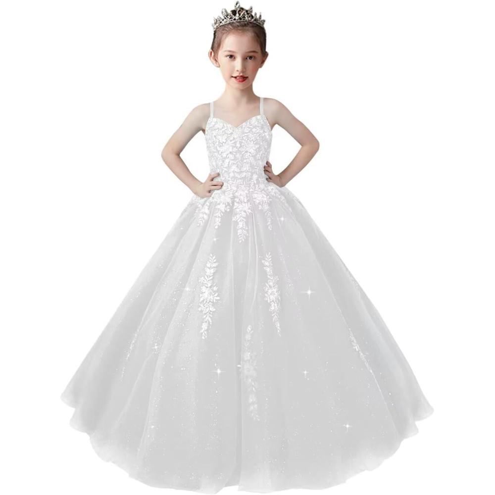 Lace Applique Tulle Pageant Gowns for Girls Ball Gown Flower Girl Dress Princess Toddler Kids Prom Dress(White)