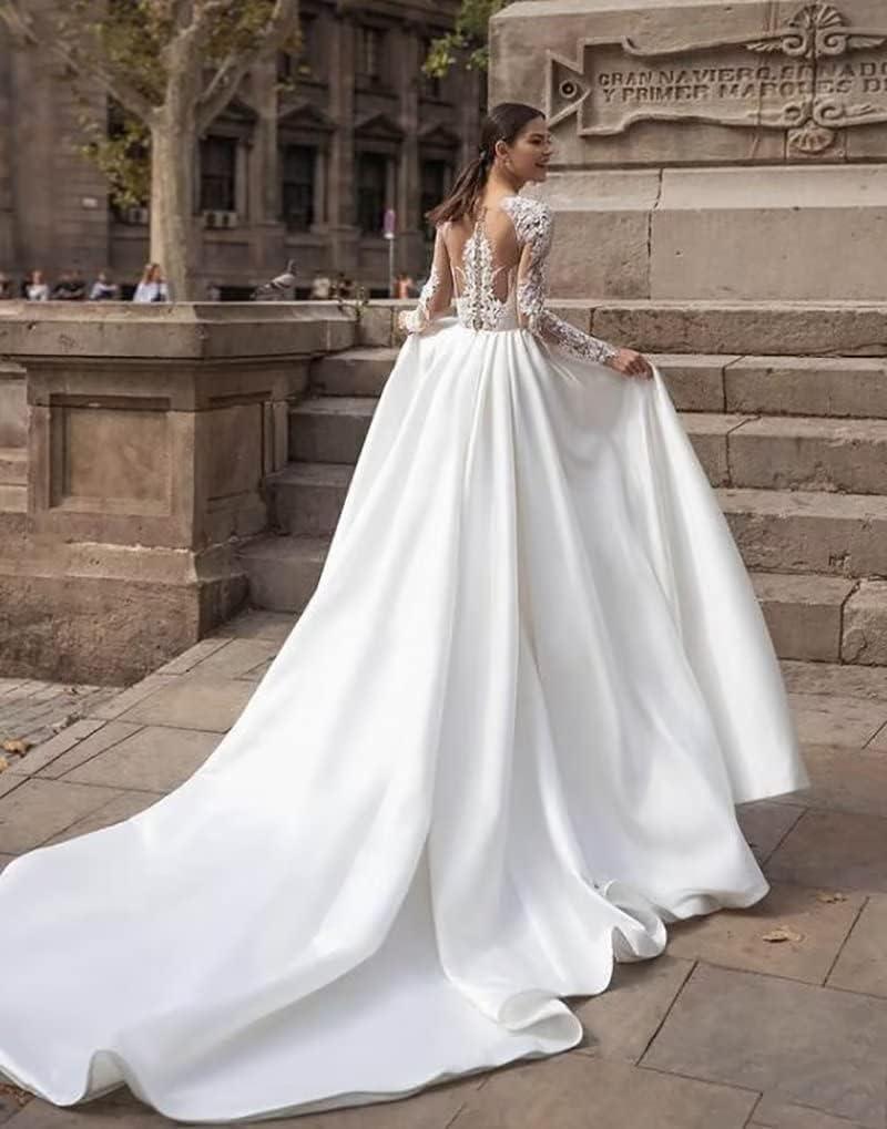 Long Sleeve Lace Wedding Dresses for Bride Satin Ball Gowns Simple V Neck Bridal Gowns for Women(C-white)