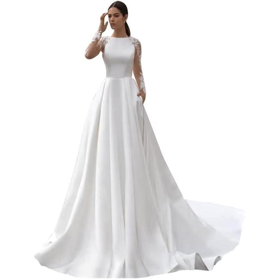 Long Sleeve Lace Wedding Dresses for Bride Satin Ball Gowns Simple V Neck Bridal Gowns for Women(P-white)