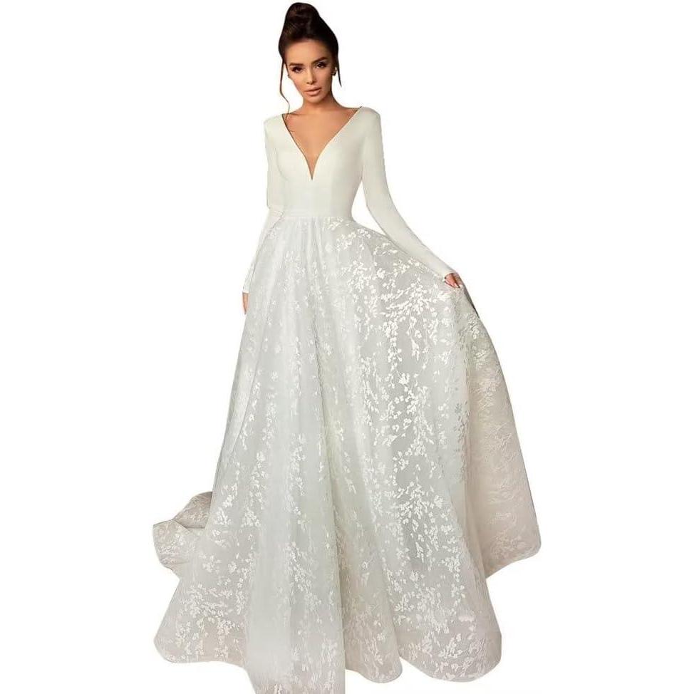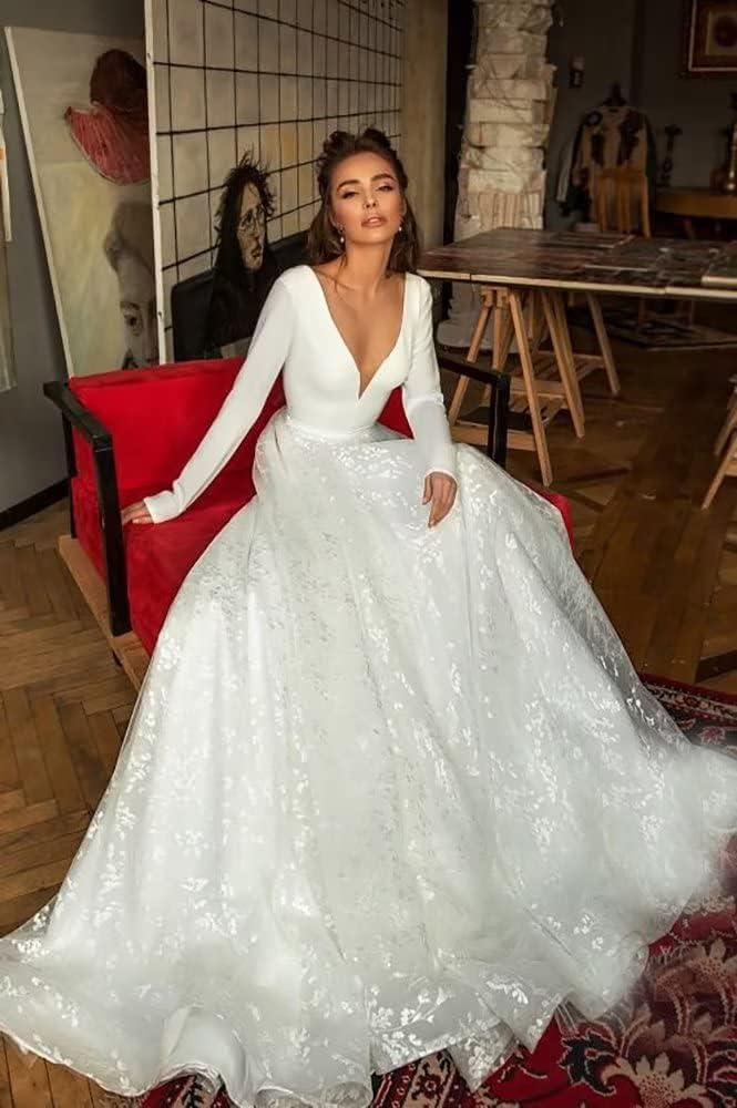 Long Sleeve Lace Wedding Dresses for Bride Satin Ball Gowns Simple V Neck Bridal Gowns for Women(F-white)