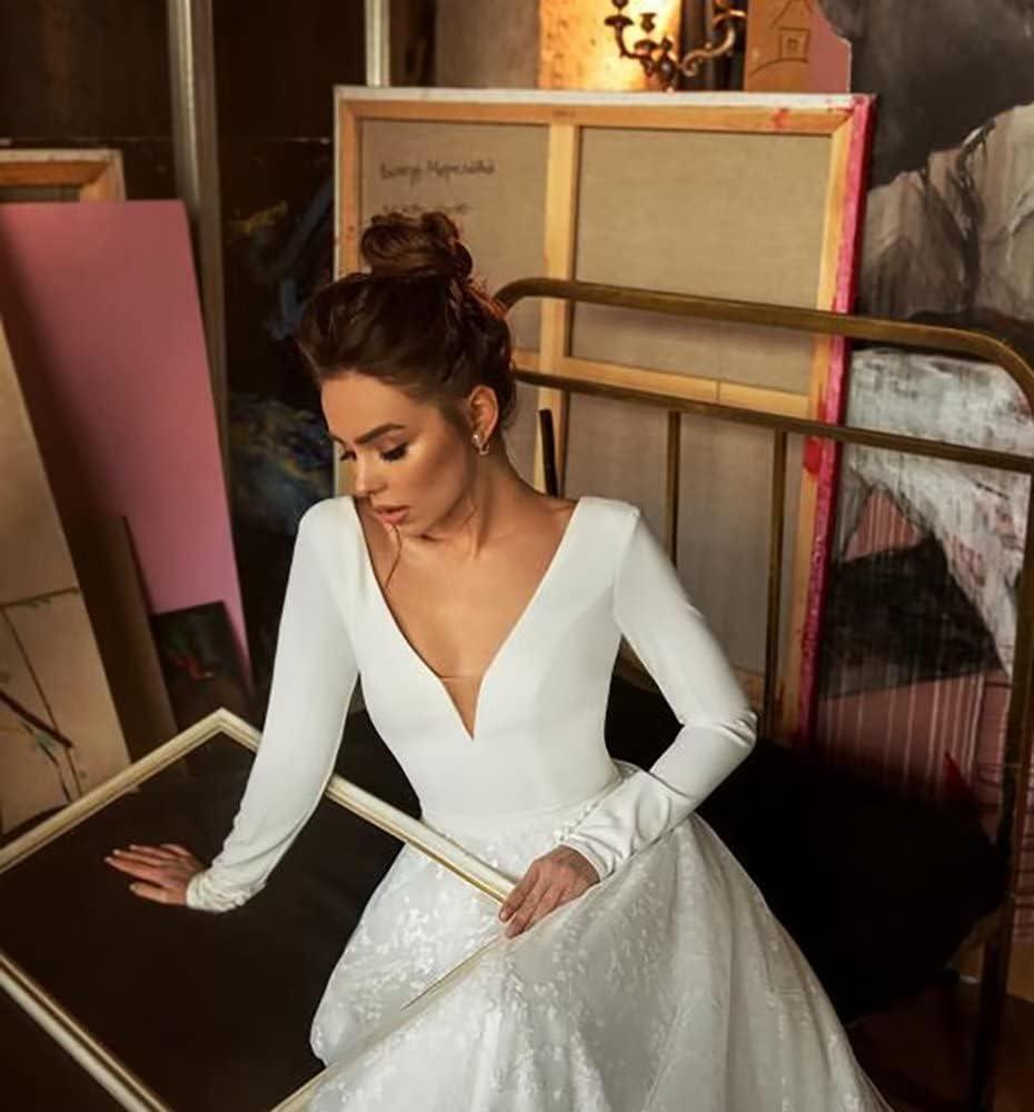 Long Sleeve Lace Wedding Dresses for Bride Satin Ball Gowns Simple V Neck Bridal Gowns for Women(K-white)