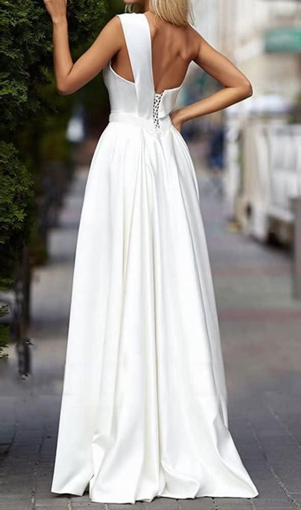 Long Sleeve Lace Wedding Dresses for Bride Satin Ball Gowns Simple V Neck Bridal Gowns for Women(S-white)