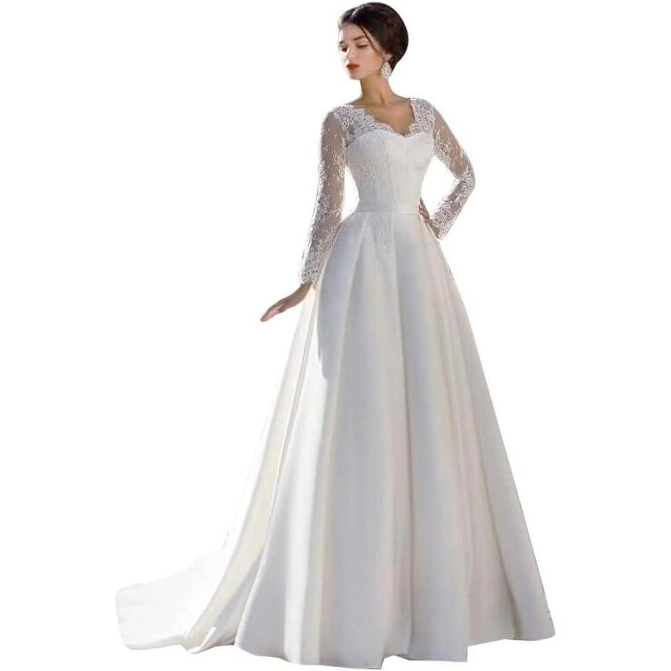 Long Sleeve Lace Wedding Dresses for Bride Satin Ball Gowns Simple V Neck Bridal Gowns for Women(White)