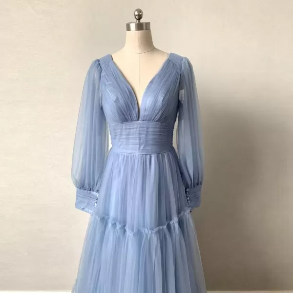 Long Sleeve Prom Dress Tulle Ball Gown V Neck A Line Wedding Dress Plus Size Formal Evening Gowns for Women(Dusty Blue)
