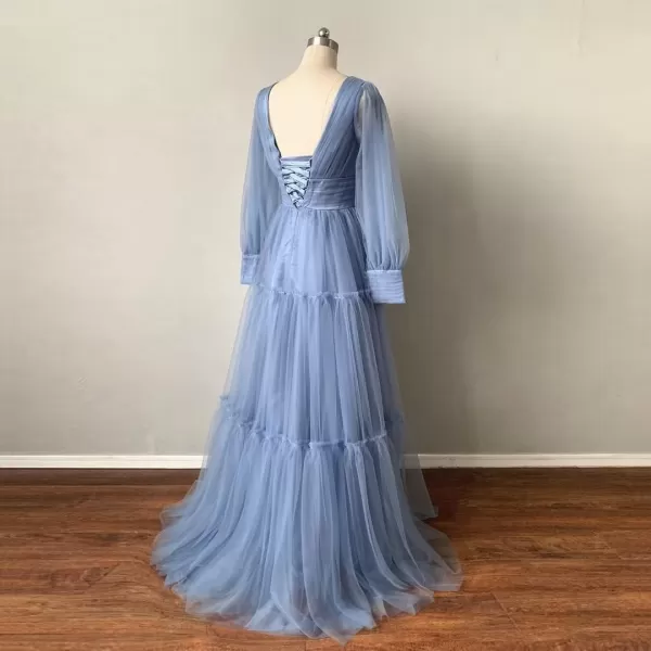 Long Sleeve Prom Dress Tulle Ball Gown V Neck A Line Wedding Dress Plus Size Formal Evening Gowns for Women(Lake Blue)