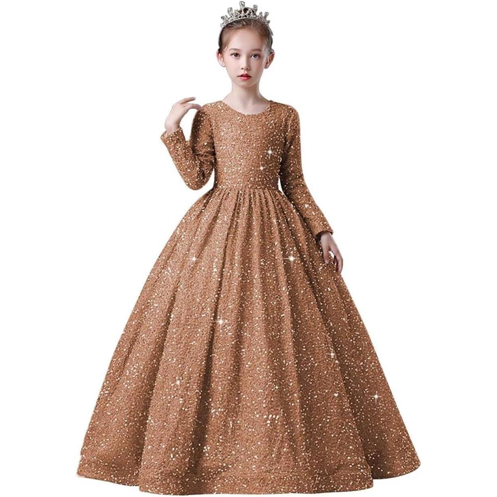 Long Sleeve Sequin Pageant Dress Sparkly Flower Girl Dresses for Wedding Prom Kids Princess Ball Gown(Brown)