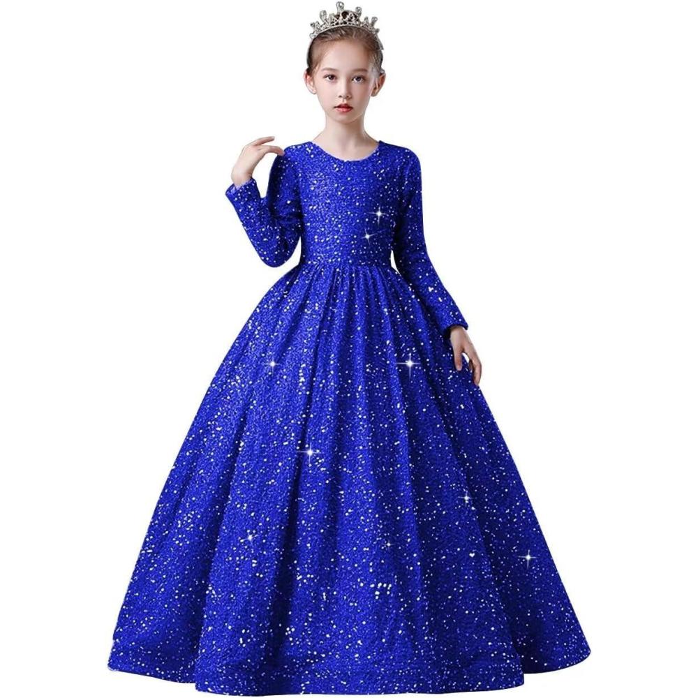 Long Sleeve Sequin Pageant Dress Sparkly Flower Girl Dresses for Wedding Prom Kids Princess Ball Gown(Royal Blue)