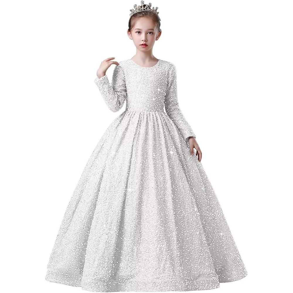 Long Sleeve Sequin Pageant Dress Sparkly Flower Girl Dresses for Wedding Prom Kids Princess Ball Gown(White)