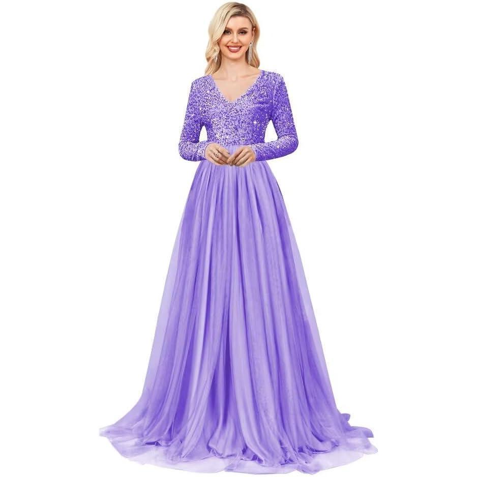Long Sleeve Sequin Prom Dresses for Women A Line Ball Gown V Neck Tulle Formal Dress Sparkly Evening Gowns(Lavender)