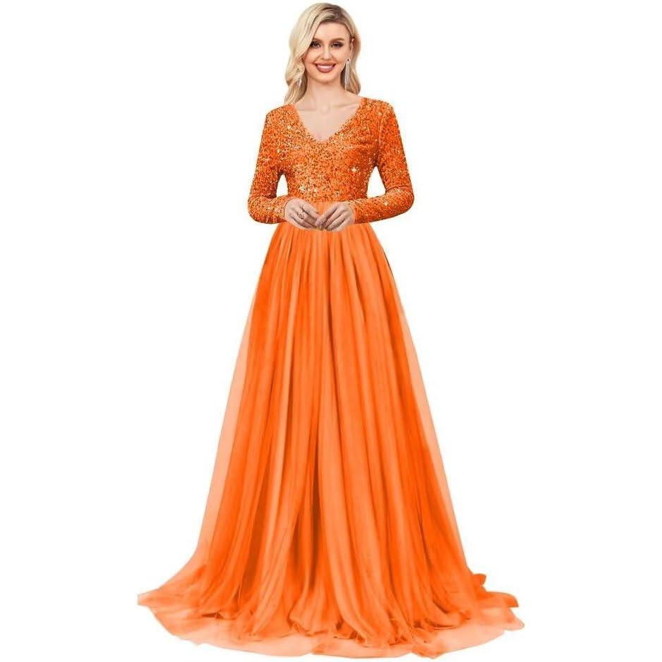 Long Sleeve Sequin Prom Dresses for Women A Line Ball Gown V Neck Tulle Formal Dress Sparkly Evening Gowns(Orange)
