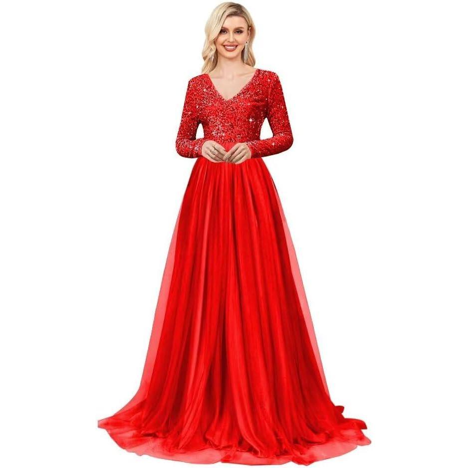 Long Sleeve Sequin Prom Dresses for Women A Line Ball Gown V Neck Tulle Formal Dress Sparkly Evening Gowns(Red)
