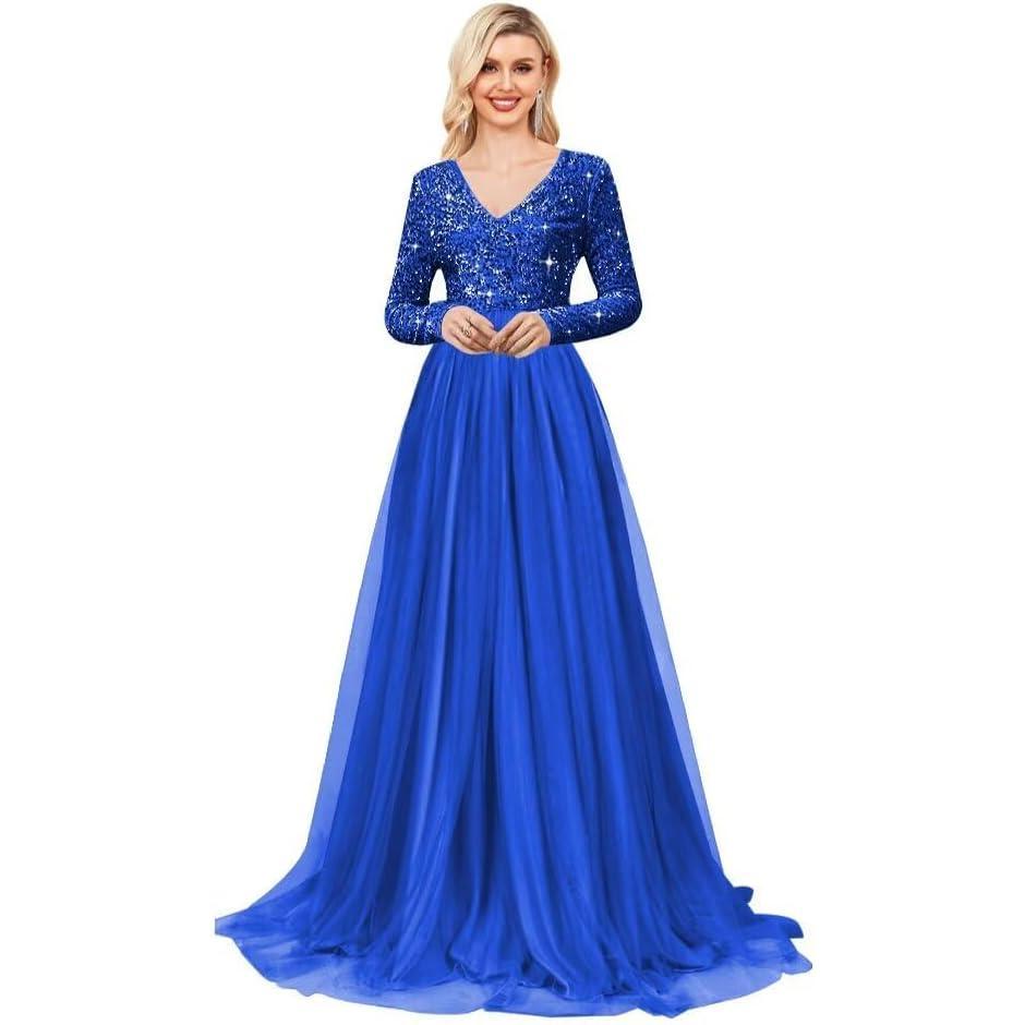 Long Sleeve Sequin Prom Dresses for Women A Line Ball Gown V Neck Tulle Formal Dress Sparkly Evening Gowns(Royal Blue)
