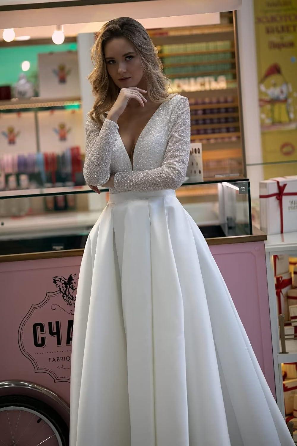 Long Sleeve Wedding Dresses for Bride Simple Satin Wedding Gown Lace Appliques Tulle Country Wedding Dress Bride Gown(White-style13)