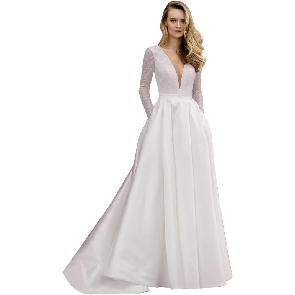 Long Sleeve Wedding Dresses for Bride Simple Satin Wedding Gown Lace Appliques Tulle Country Wedding Dress Bride Gown(White-style11)