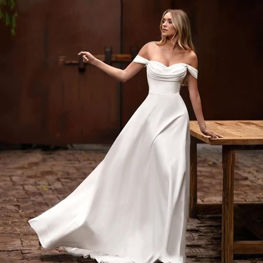 Long Sleeve Wedding Dresses for Bride Simple Satin Wedding Gown Lace Appliques Tulle Country Wedding Dress Bride Gown(White-style4)