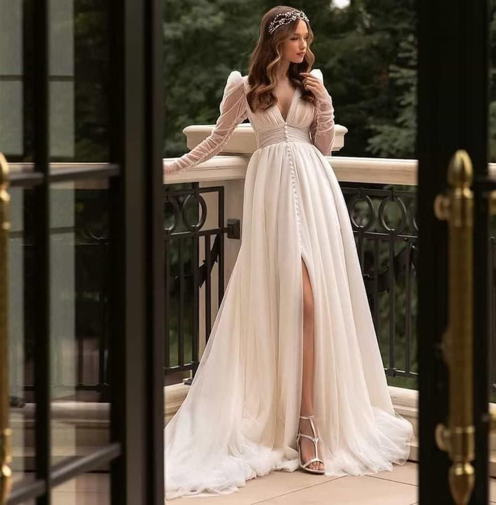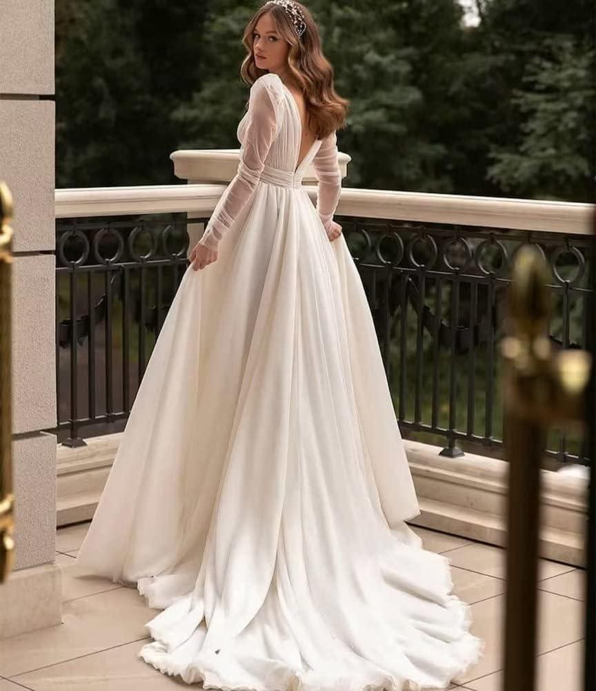 Long Sleeve Wedding Dresses for Bride Simple Satin Wedding Gown Lace Appliques Tulle Country Wedding Dress Bride Gown(White-style7)